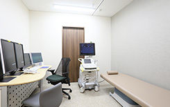 仰向けの状態で、乳房に機械を当てて病変を探す検査です。超音波検査は、女性臨床検査技師がおこないますのでご安心ください。